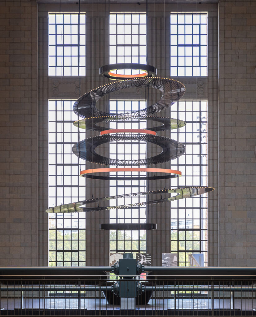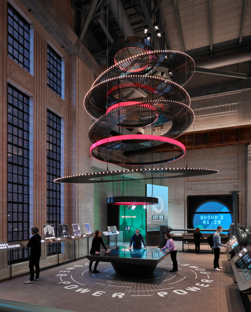 Upon entry to the Turbine Hall A, visitors can view the immense, bespoke, seven-tiered circular, lighting pendant hung in the vast north-west window above an interactive AV table. Visitor interactions, in response to narratives inspired by Battersea Power Station, trigger surges in power that ignite the Turbine inspired pendant and AV table through an array of light delivered by 172 individually addressed nodes and coloured rings of light.