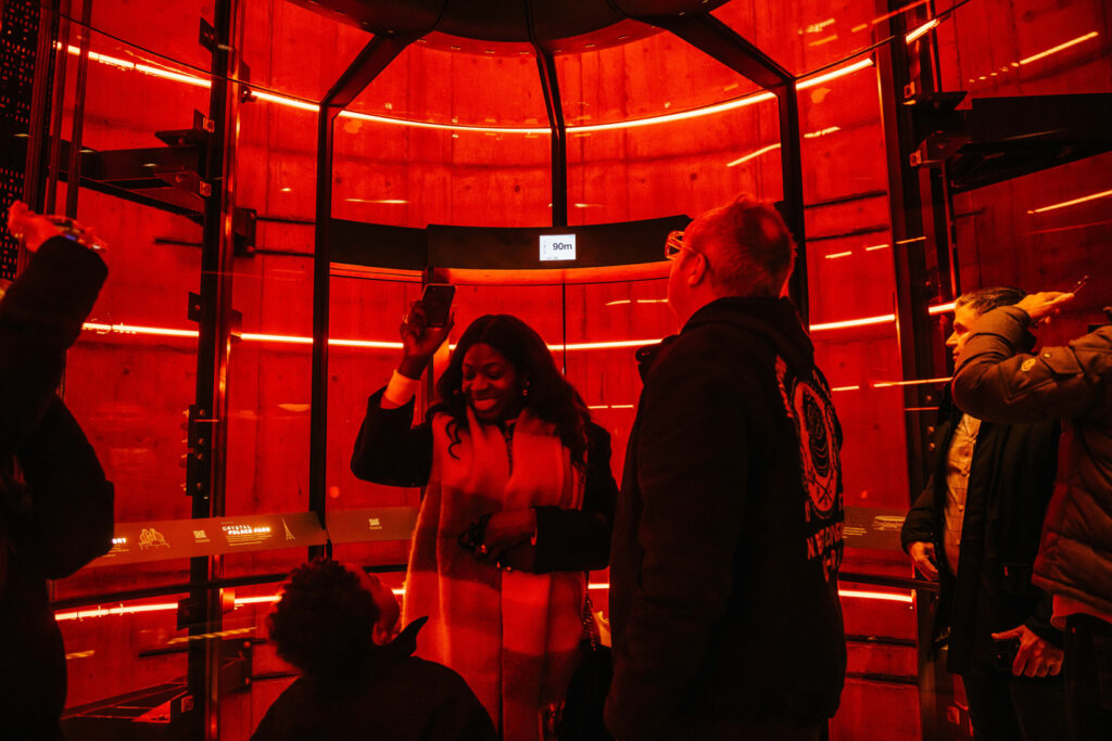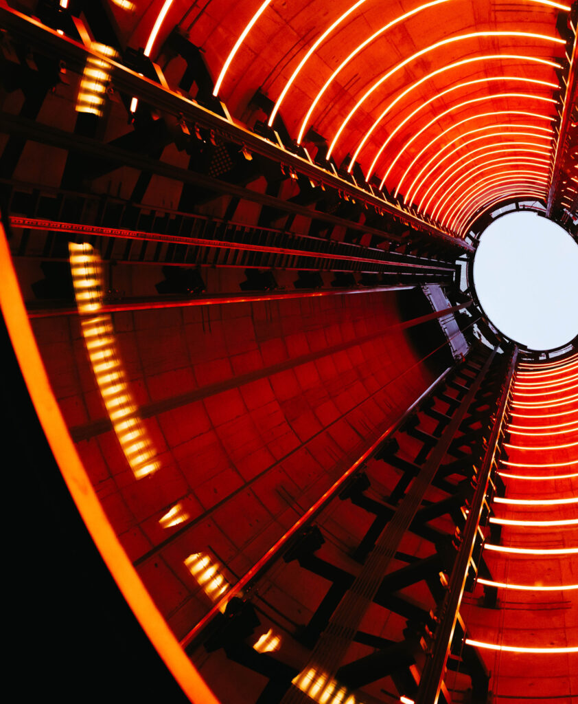 The lighting experience inside the chimney is awe-inspiring. Dynamic light shows within the chimney interact with visitors throughout various light sequences. Upon stepping into the lift, the rings pulsate and multiply, and the light quickly raises up and comes crashing down into a crescendo. The lighting extends to infinite across the lift walls and ceiling as the elevator reaches the height of its ascent. As the lift descends, the ring lights shine outwards in a halo of white light, granting visitors an intimate illumination of the interior architecture of the chimney.