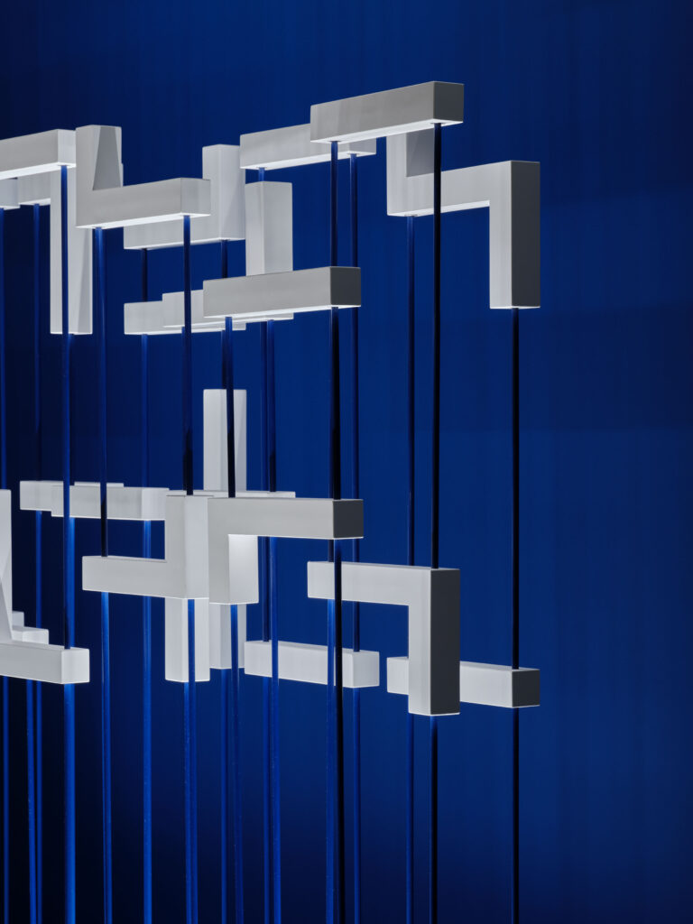 Michael Grubb Studio developed a scheme that combined existing track lighting with RGB lighting integrated into the setworks, providing excellent flexibility and control throughout the gallery. This allowed for precise illumination adjustments to ensure objects were evenly lit while staying within conservation limits. The contemporary exhibition design by All Things Studio featured graphic architectural elements, which we complemented with subtle but effective lines of light to reinforce the spatial design.