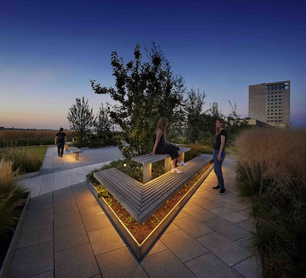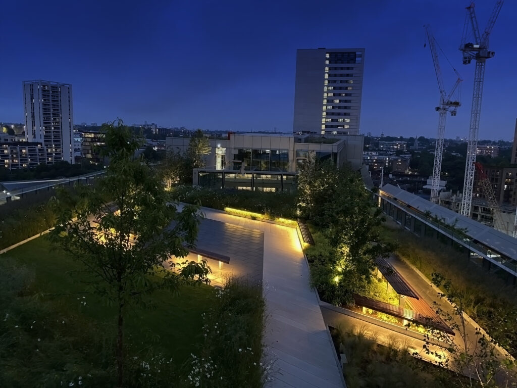 When the roof terraces are being used for special events and private hire, a temporary lighting overlay can be used. This approach provides flexibility and prevents the need for additional clutter that is not required on a permanent basis. Additional exterior rated power supply points are strategically positioned throughout the communal roof terraces – discreetly hidden within structures, furniture, and soft planting areas. These points provide flexibility and allow for the temporary lighting installations to be installed as needed.