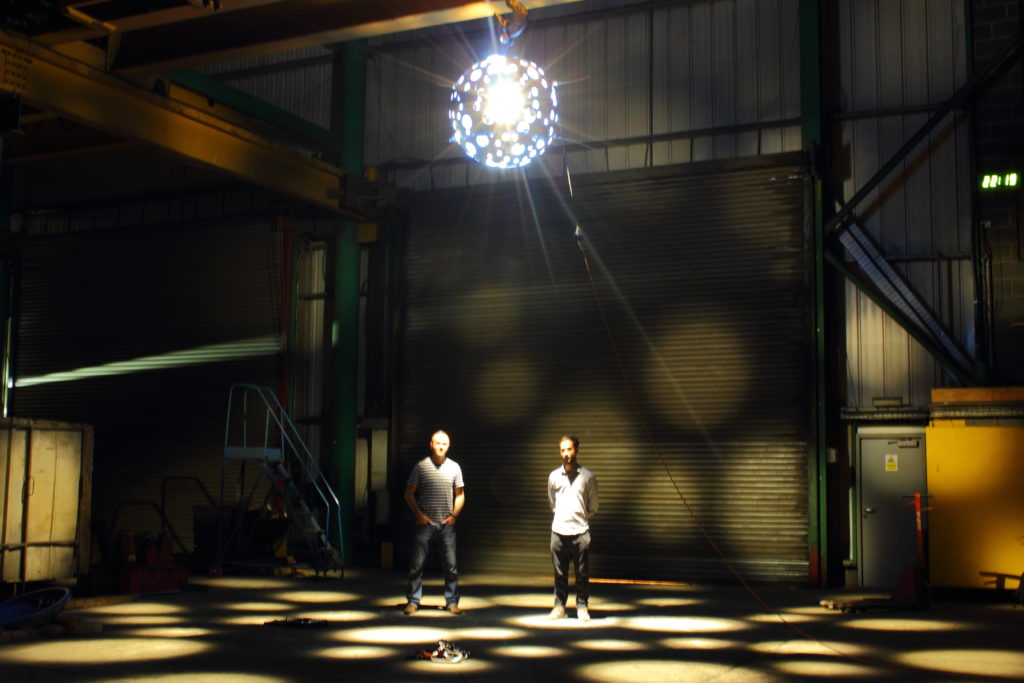 A further set of mock ups were conducted which explored the detail of the construction of the sphere itself, including how it would connect to the catenary system. Tests also looked at access for maintenance, and most crucially the design and drilling of the holes. Consideration was given not only to creating the desired pattern at night but also to look good during the day. Three prototypes with varying hole sizes were constructed, rigged up, filmed and reviewed by Speirs +Major, Michael Grubb Studio and LLDC before the final design was selected based on a compromise between the most playful effect with the largest areas of light and darkness; and a base level of uniformity required for CCTV.