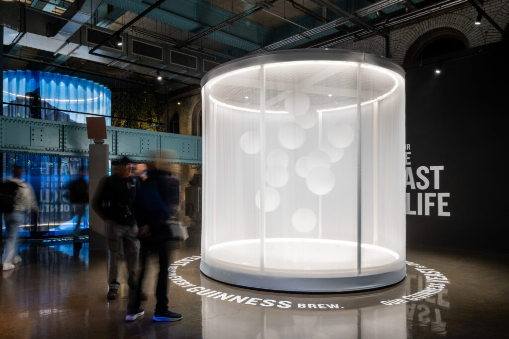Completing the famed list of ingredients is yeast, the secret behind Guinness’s creamy texture. Working closely with the creative fabrication team at Codstakes, cool (4000k) light is concealed around the circumference, with recessed spotlighting introduced above to emphasise the form of the spheres that float and move within the upward airflow. This combination of light and movement creates an ethereal ambiance, underscoring its crucial role in the brewing journey.