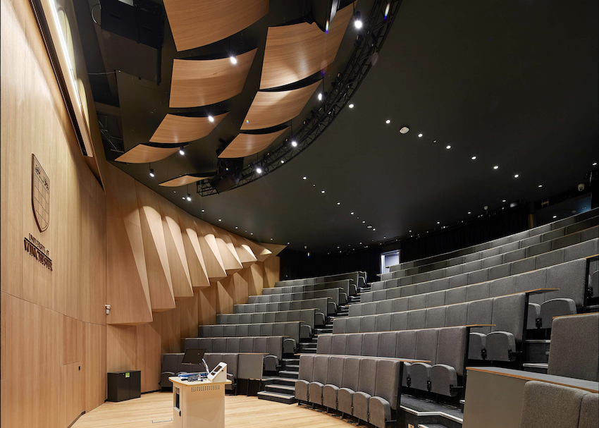 The Auditorium, independently illuminated, is fully adjustable using pre-set and customisable scenes capable of providing functional lighting for lectures, dim lighting for events and presentations as well as stage only lighting for event use.